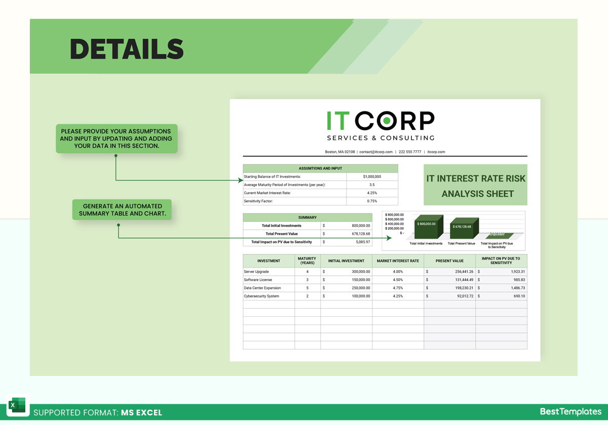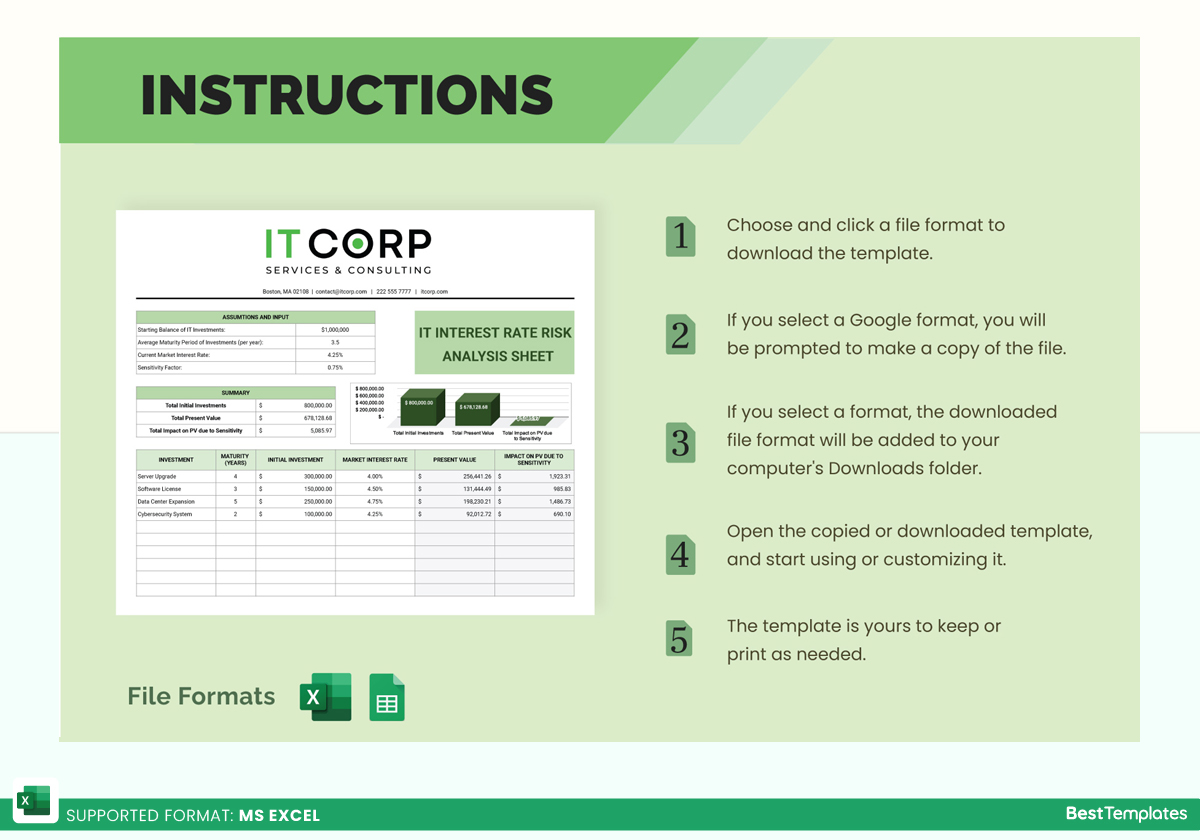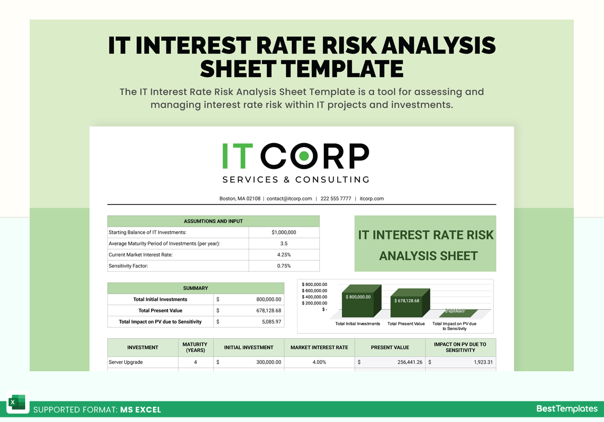 Download this incredible template now and tailor it to your unique requirements to streamline your IT interest rate risk assessment process and make data-driven financial decisions with confidence.