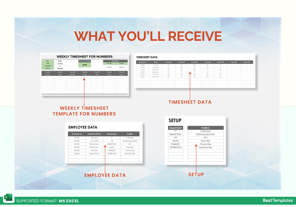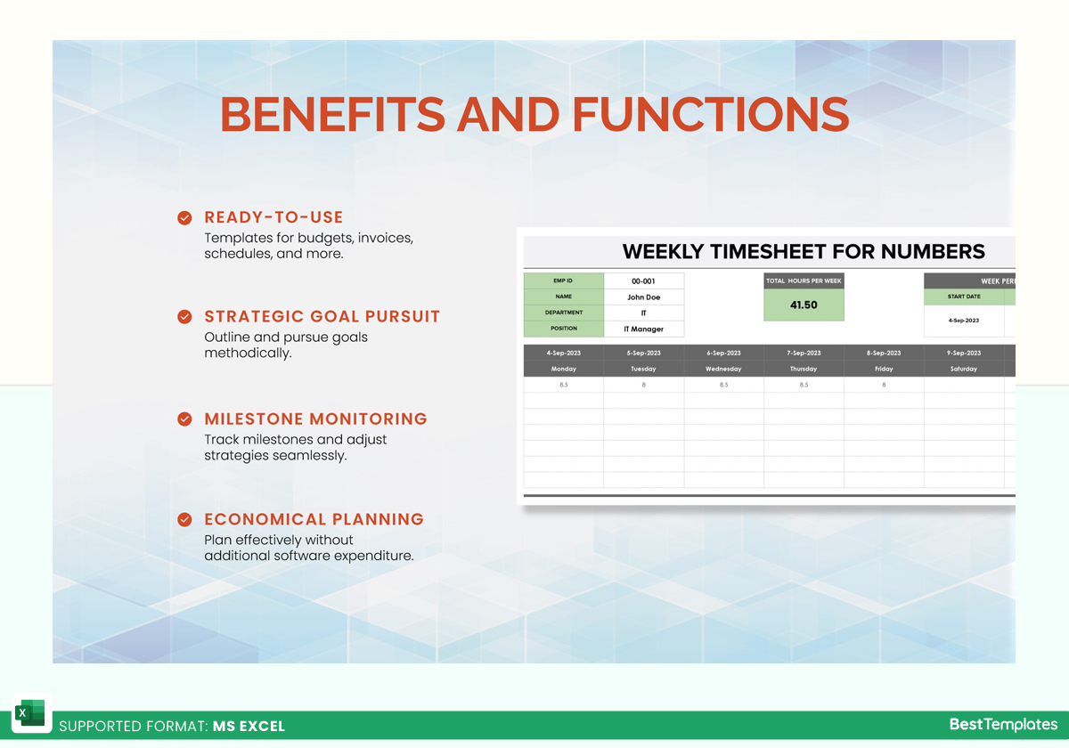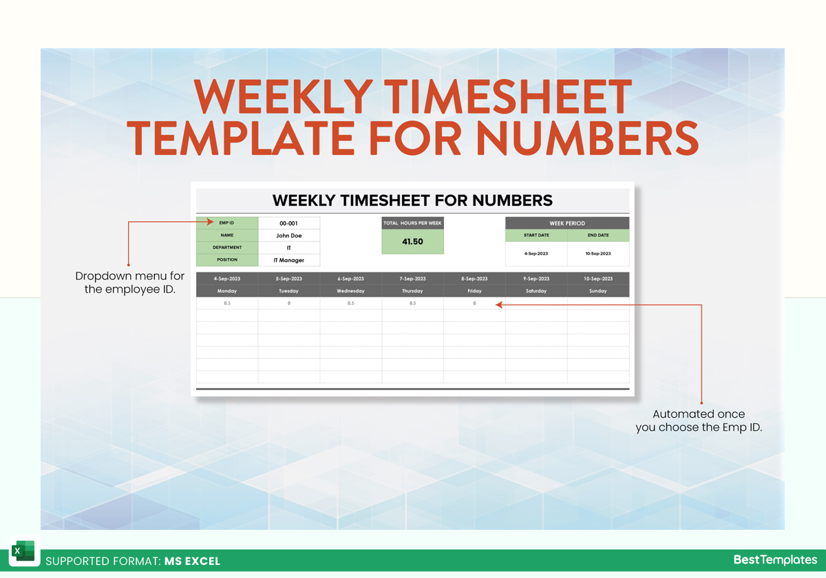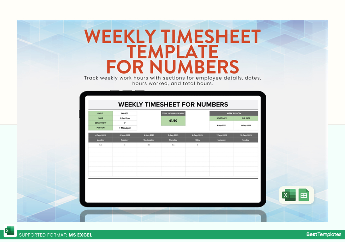 Effortlessly track work hours with our Weekly Timesheet Template — now available for Numbers, Google Sheets, and Excel. Seamlessly compatible with all three platforms, this template simplifies time recording, overtime calculation, and break tracking.