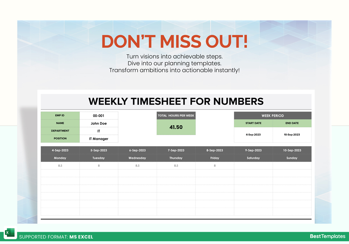 Transform your workflow and enhance efficiency — download your Weekly Timesheet Template today!